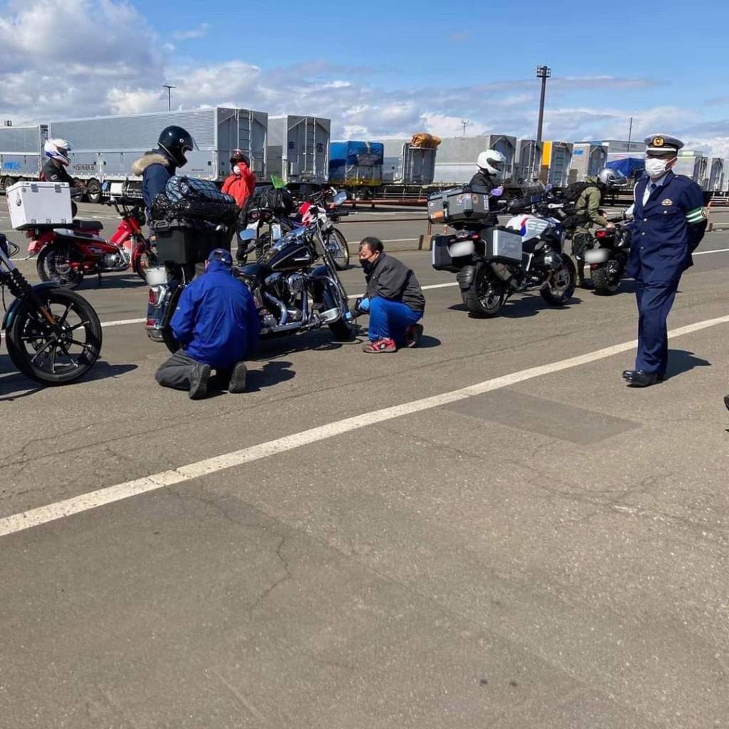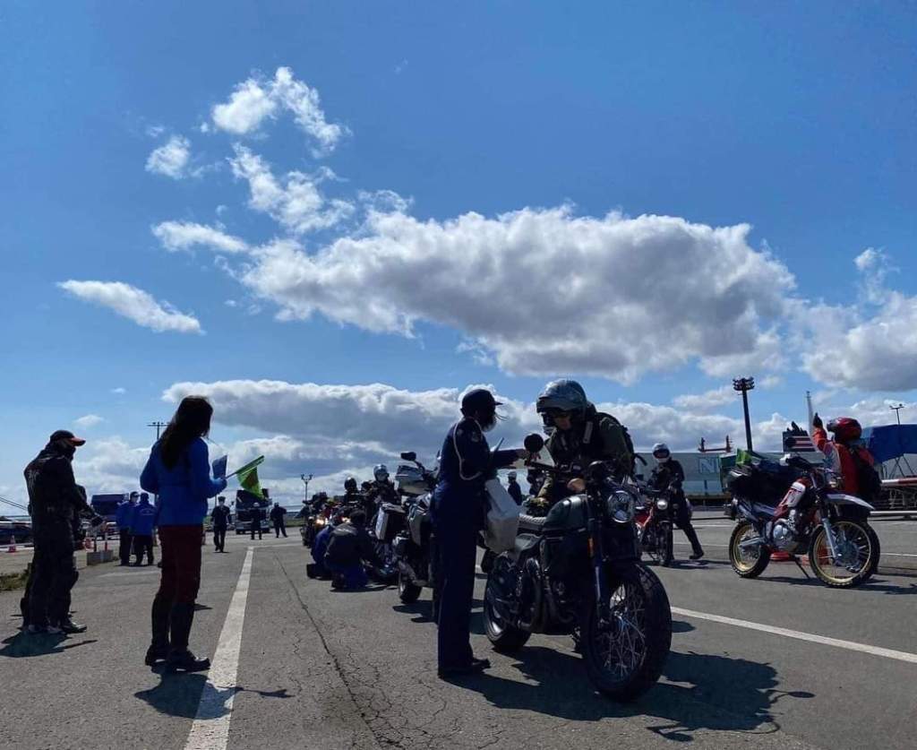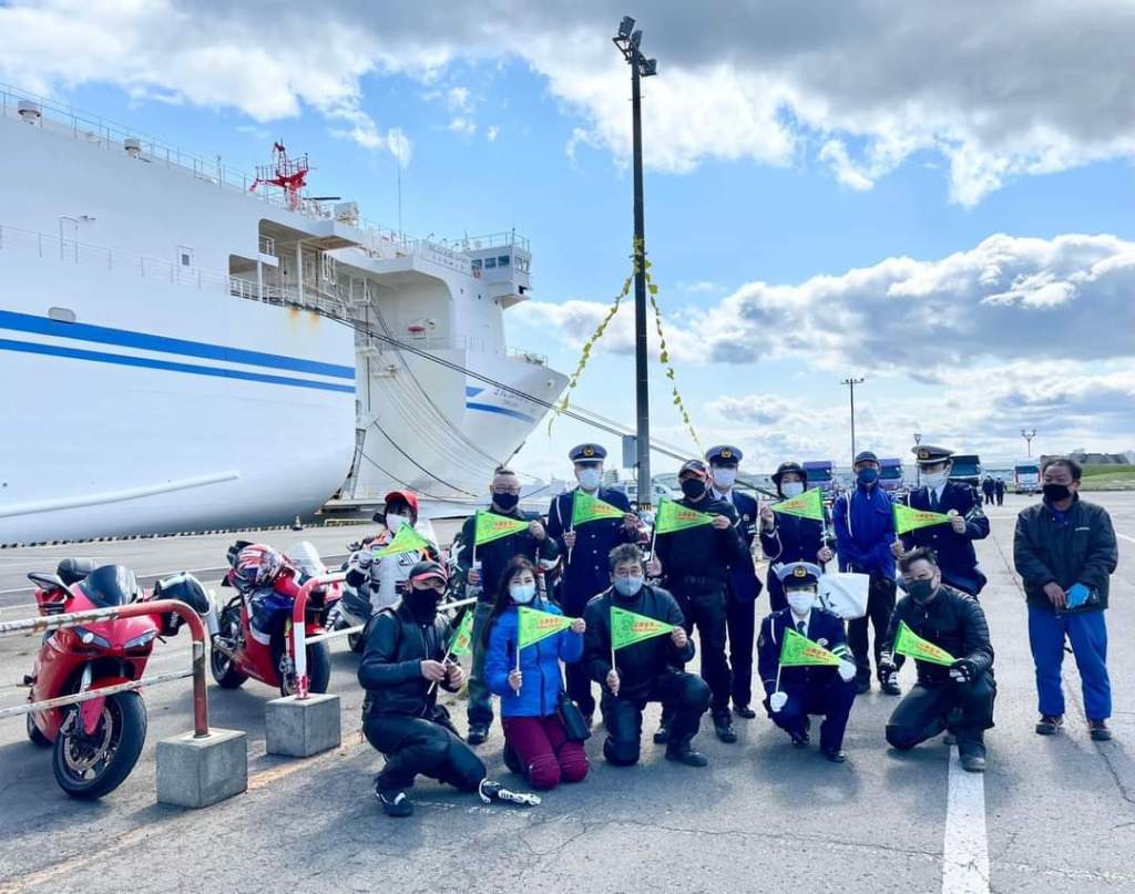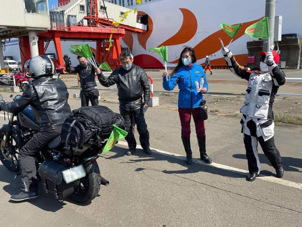 13:30頃下船するライダーに、交通安全グッズ配布、白バイ隊員ワンポイントアドバイス!